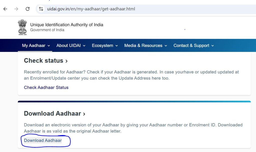 - Click on “Download Aadhaar” under the My Aadhaar tab.