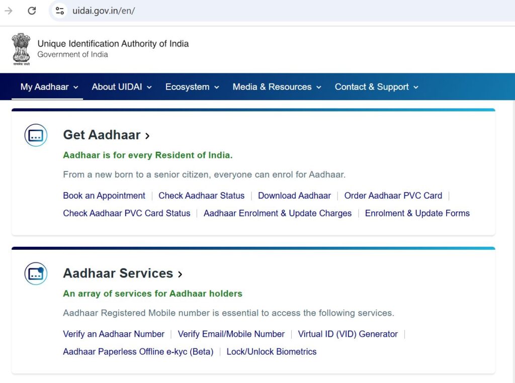 - Visit the UIDAI official website:Go to https://uidai.gov.in.